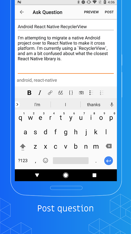 - Draft questions on the go, even when you’re offline. Markdown tools make it easy to add images and code blocks.