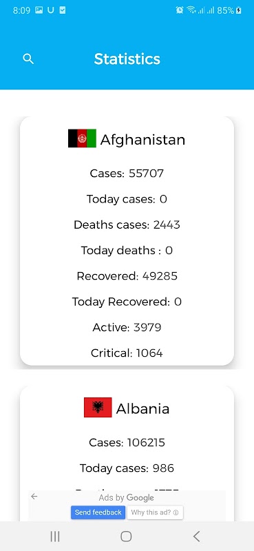 该应用程序为所有国家/地区提供了有关受感染,活跃的统计信息