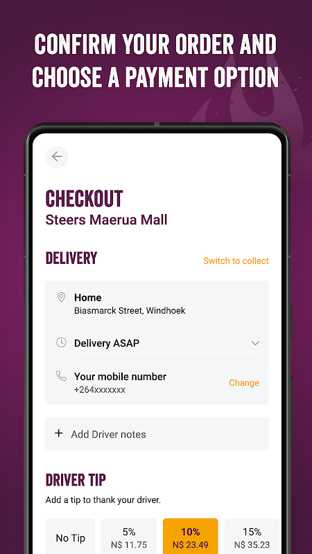 您现在可以通过官方Steers应用程序订购和支付火焰烤制餐。查找离您最近的餐厅,从我们的产品系列中进行选择,定制您的订单和结账。