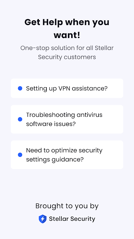 Stellar 支持是为所有 Stellar Security 客户提供的一站式解决方案。该支持应用程序专为满足依赖 Stellar 安全产品套件的用户的不同需求而量身定制。无论您需要设置 VPN、解决防病毒软件问题或了解如何优化安全设置方面的帮助,Stellar 支持都能满足您的需求。