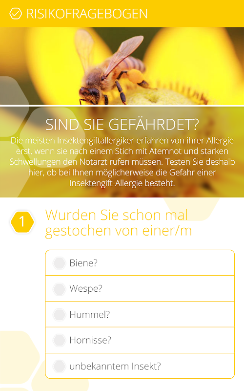 你是否有昆虫毒液过敏的风险增加存在使用交互式问卷,你可以在几分钟内确定。集成的雕刻日记可以记录昆虫叮咬和他们的个人医疗会诊影响。