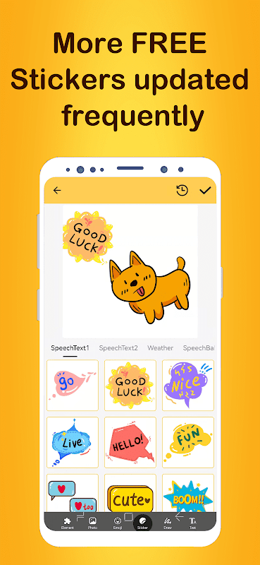 - Sticker : Includes 9 types of 250+ Stickers, including Weather, Speech Text, Speech Balloon, Text, Cute, Pixel, Halloween, Letter, etc. More stickers will be updated continuously