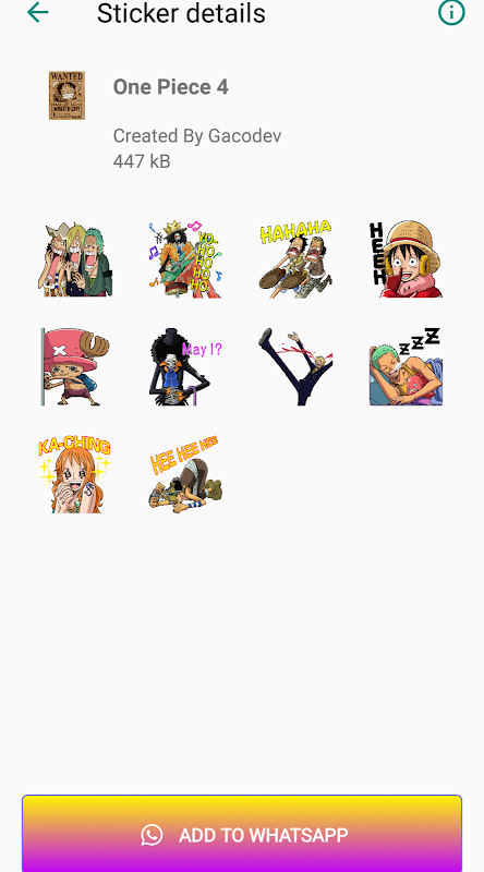 Setelah merilis wallpaper narruto kami dari gacodev akan merilis sebuah aplikasi dengan judul Sticker wa One Pieece lucu terbaru WAStickerApps Penasaran sticker lucu apa saja didalamnya??, Yuk segera miliki koleksi sticker WA ONE PIiECE terbaru dan terbaik yang pastinya bakal seru