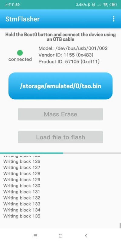 2.Hold the Boot0 button and connect the device using an OTG cable.