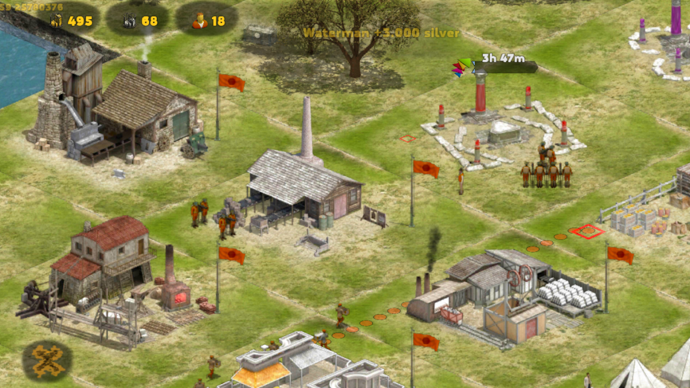 Different amounts of gold and silver deposits are distributed on land tiles. Mine resource rich tiles, and block enemy players. There are three types of Bases that Player can build. Each type has its own function. Player can have 10 Bases. There are two types of Units on the Sector map. Each unit has a level from 1 to 10. Player can have 10 Units.