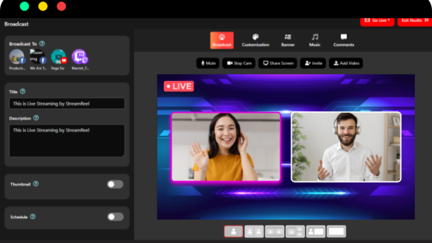 在您正在直播的多个社交媒体网站上邀请客人、共享屏幕、管理和回复评论