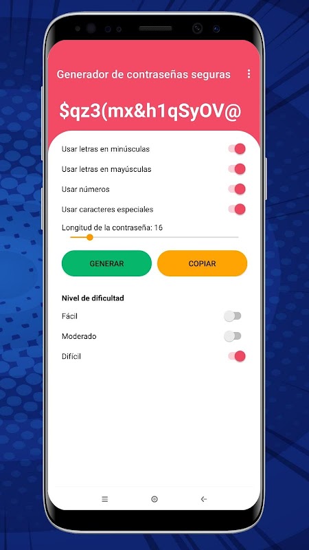 随机且安全的密码生成器。此应用程序允许您创建独特且强大的密码来保护您的个人信息。通过不同的难度级别和可定制的选项,您可以使用大小写字母、数字和符号生成密码,并调整密码长度以满足您的安全需求。保护您的在线帐户并立即下载密码生成器!