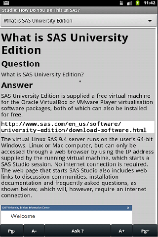 This app, "Studio: How Do You Do This In SAS?", is one of a series of eBooks about SAS software programming focusing on frequently asked questions and answers about SAS Studio and SAS University Edition, illustrated with screenshots, and by code samples which can be sent by email directly from the app. It is designed to encourage users to contribute questions some of which will be included in future versions of the app. There are controls to select specific questions, move to the previous or next question, decrease or increase the font to suit the user's preference, and send emails requesting answers to questions not yet included in that version of the eBook.