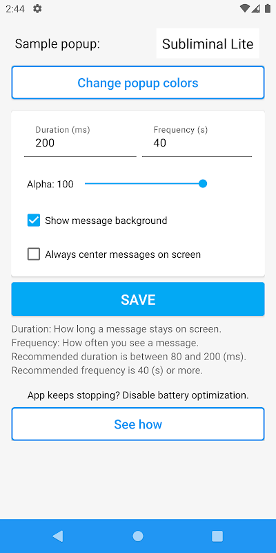 该应用程序提供视觉潜意识信息,您的大脑可以在您不知情的情况下接收这些信息。使用我们的专业版,您可以进一步自定义您的体验。添加无限的消息,更改文本大小,并一次性添加多条消息。此外,当新功能可用时,您将是第一个获得这些功能的人。