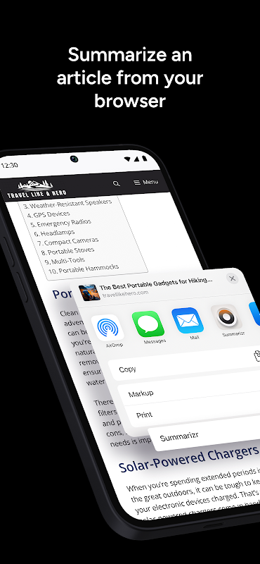 将 Summarizr 与您设备的共享功能无缝集成,以便直接从浏览器或其他应用程序快速轻松地进行摘要和翻译。