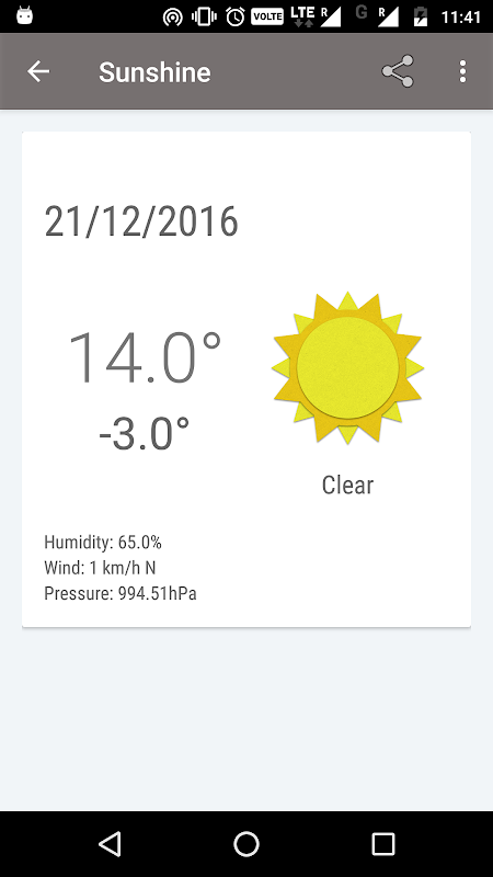 阳光是我的学习经验。这是一个Android UDACITY课程的一部分。此应用程序讲述当天的预报下列14天的用户。所以,如果你正打算出门,阳光会告诉你,你是否需要带伞。
