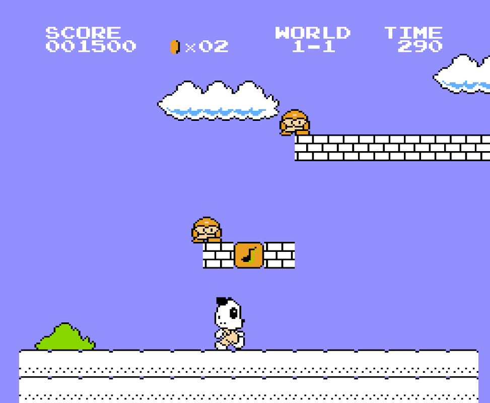 The game world features coins scattered around for Panda to collect and special bricks marked with a music note, which when hit from below by Panda may reveal more coins or a special item. Other "secret", often invisible, bricks may contain more coins or rare items. If the player gains a Potion, Panda grows to double his size and gains the ability to break bricks above him. If Panda gets hit in this mode, then instead of dying he turns back to regular Panda.