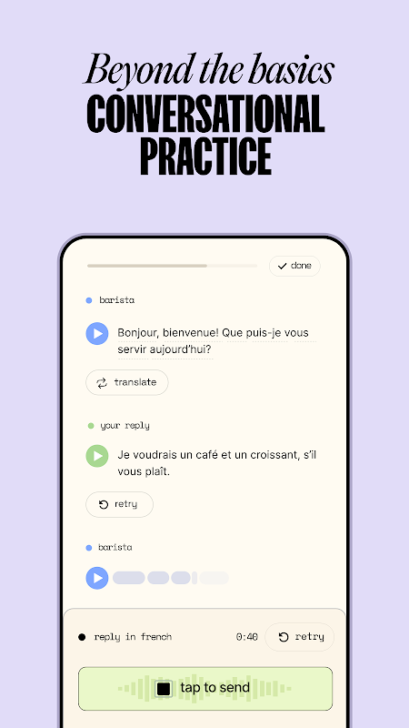 准备好超越基础了吗?通过专为日常生活设计的会话式语言学习,轻松掌握流利的语言。Superfluent 将带您体验数百个真实场景,并持续提供反馈,帮助您以超乎想象的速度从半流利提升到超级流利。