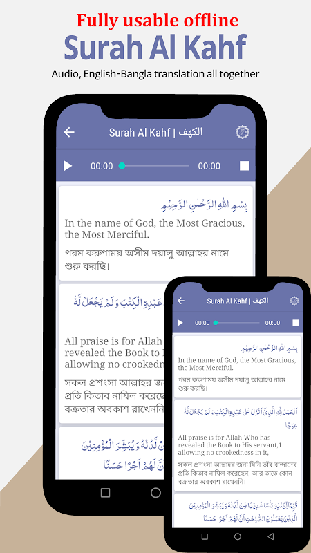 我们使 Surah Al Kahf 应用程序变得用户友好,以帮助想要背诵或聆听理解 surah 的用户。我们添加了该章的阿拉伯语文本以及英语和孟加拉语的翻译。