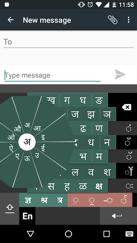 在梵文中,我们经常需要输入的组合A 辅音(ध)和马特拉(ो)像ध+ो=धो。当你触摸一个辅音,辅音有10个经常matras组合和查克拉弹出(धा,धि,धी,धु,धू,धे,धै,धो...)。该轮给出了可能的字符组合的预览。要选择一个组合,滑动触控笔或手指朝它。