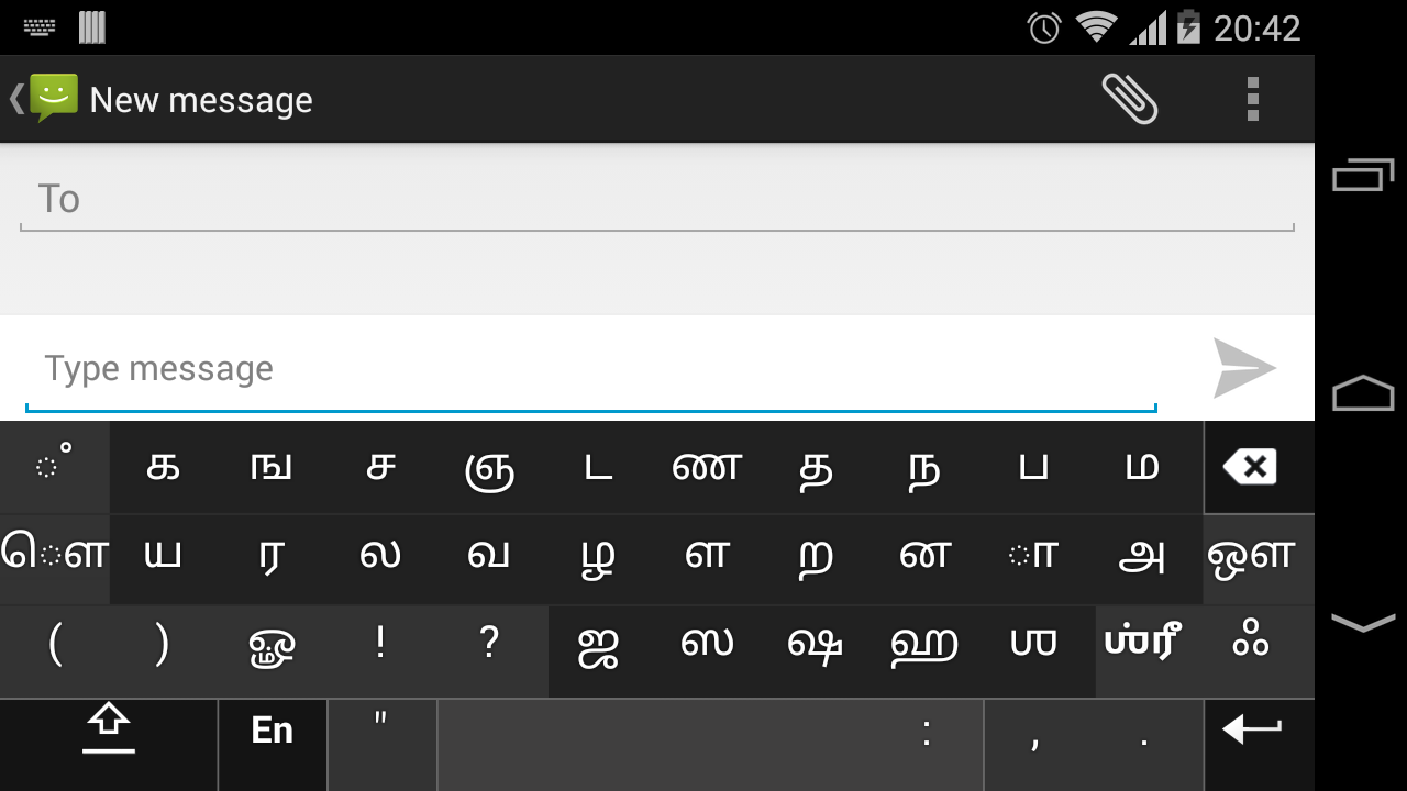 完整的元音(அ,ஆ,இ,ஈ,உ,ஊ,எ,ஏ,ஐ... )出现在右下角单独轮。该少用元音和matras的旁边(ஔ,ௌ,ஃ)。数字,符号和很少使用的字符出现在移位。你也可以暂时切换到QWERTY键盘输入英文字符。