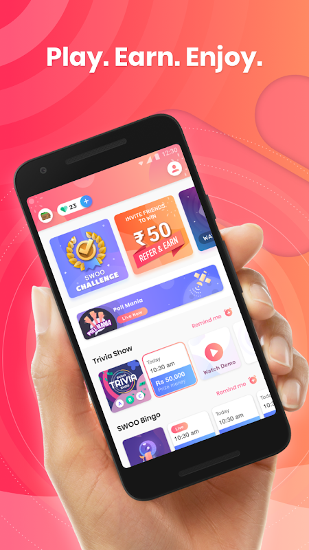 With mobile games like Cricket, Candy, Pinball, Teen Patti,Bingo Trivia,Juicy Dash there is plenty to choose from, play and win rewards in SWOO app. If you love arcade games, puzzle games ,sports games ,action games or even strategy based games ,then SWOO is for you.