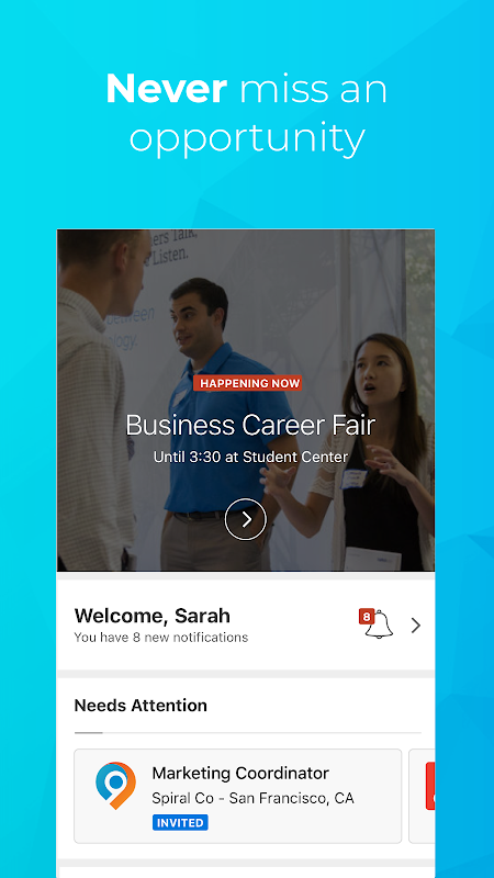 如果您的学校使用Symplicity就业服务管理器,此移动应用是必不可少的伴侣,你的事业服务的网站。有了这个程序,你可以收到根据您的兴趣和行为的工作和实习的建议;快速搜索,标记收藏和申请职位和实习;安排在校园面试;找到并参加招聘活动;有你的简历审查;建议安排约会等。可用性的特点是依赖于你的学校的参与和配置。