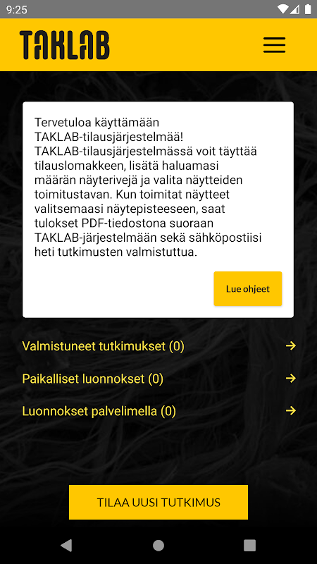 Tervetuloa käyttämään TAKLAB-tilausjärjestelmän mobiiliversiota! Voit luoda TAKLAB-yritystilin rekisteröitymällä TAKLAB-järjestelmään verkkoselaimessa osoitteessa https://app.asbestilaboratorio.fi/signup.