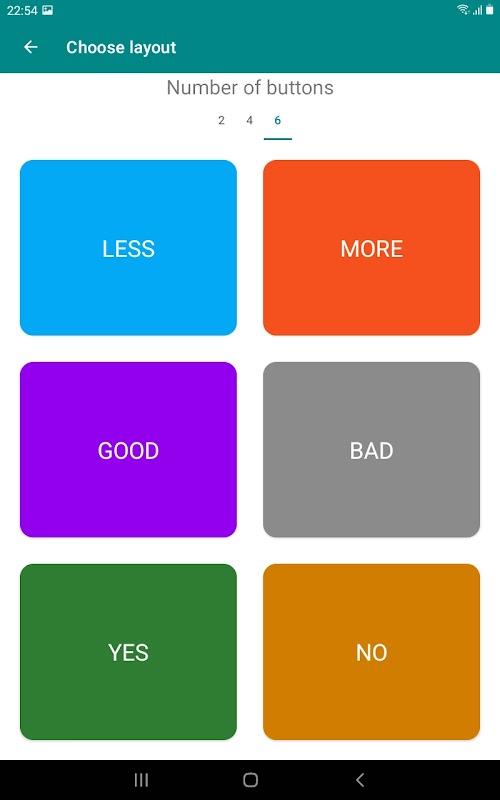 在应用程序设置中,您可以配置 2 个、4 个、6 个或任意数量的按钮,并为每个按钮分配一个短语或词语。您还可以选择每个按钮的颜色以及按钮上朗读文本的大小。如果按钮较多,您可以在配置模式下通过拖放操作重新排列它们。