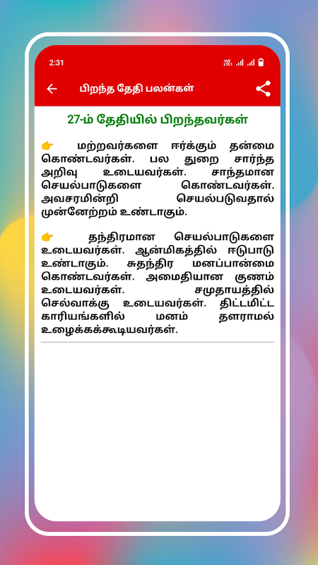• 出生日期命理学:泰米尔语命理学应用程序可让您了解您的出生日期如何影响您的个性、命运和人生道路。幸运数字应用程序准确地分析我们的出生日期。
