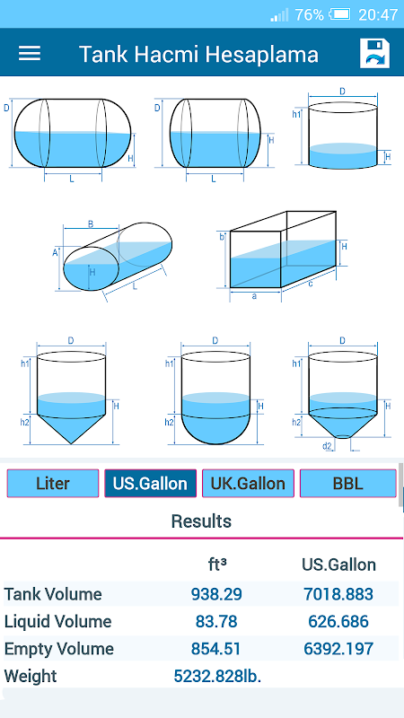 油箱容量计算器是计算坦克的体积快速和简单的应用程序。您还可以计算容器中的液体体积。如果你知道的液体密度可以计算重量的液体过