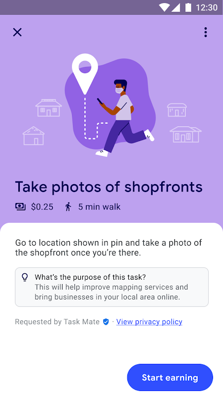 使用 Task Mate 应用程序为您的组织完成任务。任务示例包括为附近的餐厅拍照、回答调查问题或帮助将句子从英语翻译成您的当地语言。
