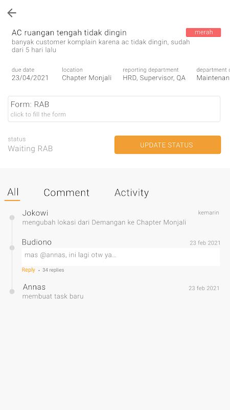 * **部门:** 按团队(经理、服务员、开发人员等)委派和跟踪工作。