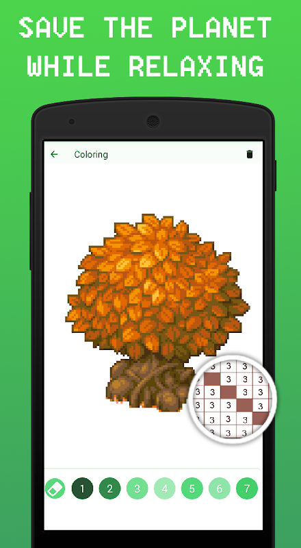 Discover a collection of beautiful trees to color by number and produce beautiful masterpieces of pixel art, while helping save the planet. Relax and release your stress while coloring the trees for the teamtrees movement.