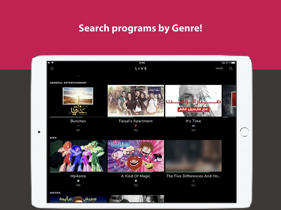 Over 50 premium Arabic channels accessible directly on your phone or tablet - LIVE.