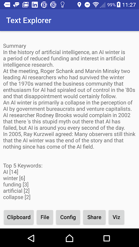 The summary can also use selected text from the clipboard or a URL as its input source. To do this just use the share as or copy selection option when you cut and paste from other apps and choose Text Explorer to process the data. Once complete, the summary can be shared or just cut/pasted into another app.