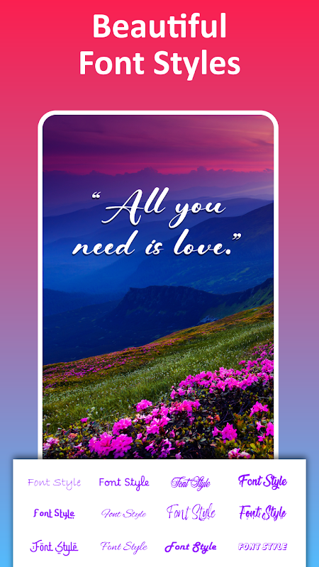 这款应用内置多种功能,助您轻松添加文字、添加文字、编辑照片文字、在照片上书写、添加引言、制作照片引言、文字艺术、在图片上添加文字。