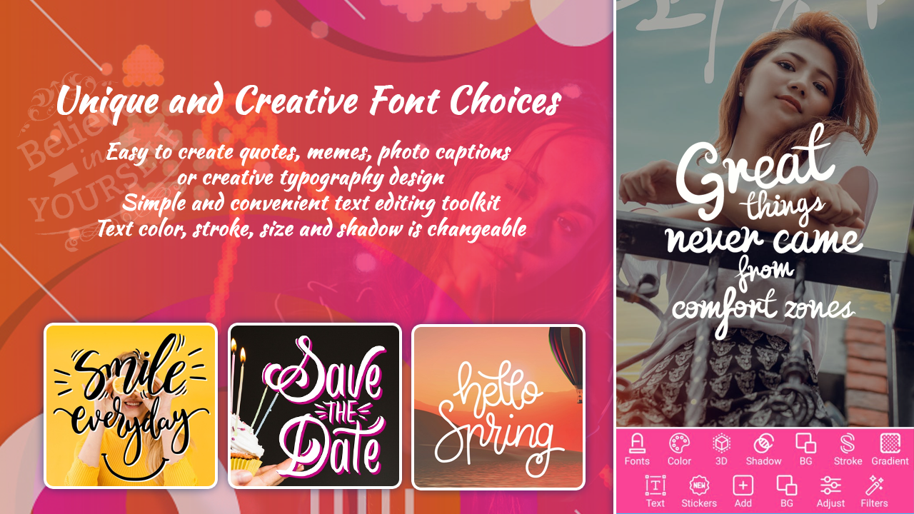 现在,使用更具创意的字体和精美的贴纸编辑您的照片。只需下载一个令人惊叹且最受欢迎的应用程序“照片上的文字,照片编辑器,文字引号制作器”即可。