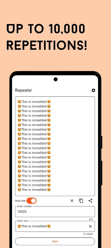 这款应用的核心功能之一是能够将任何文本片段重复数千次。只需输入您的文本,选择重复次数(最多 10,000 次),即可开始!