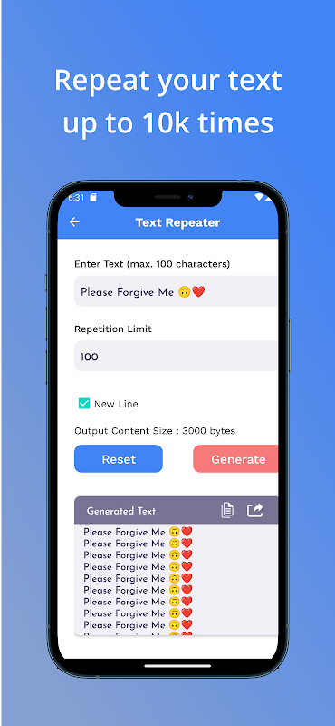 该应用程序提供了无缝且用户友好的界面,使所有技能水平的用户都可以使用它。告别多次手动复制和粘贴文本的麻烦。使用文本重复器,您可以立即生成重复文本,从而节省您宝贵的时间和精力。