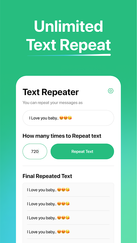 Text Repeater 是一款简单易用的应用程序,可让您发送多条消息或一遍又一遍地重复单词。只需输入您想要重复的文本,设置您想要重复的次数,然后点击发送即可。文本转发器将处理剩下的事情。