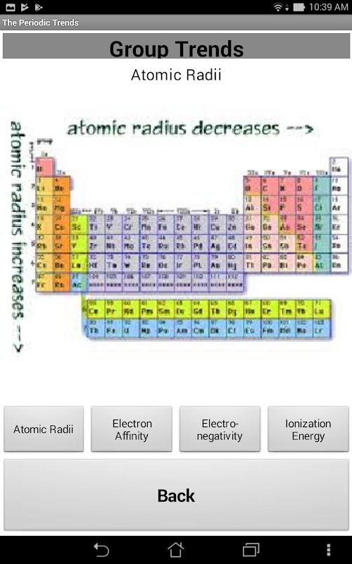 The Periodic Trends App is an app that helps students determine all of the periodic trends of the elements on the periodic table. The information on this app is usually learned in chemistry, and it is said to be a difficult concept to many students. This app is a simple way to help you with determining the differences!