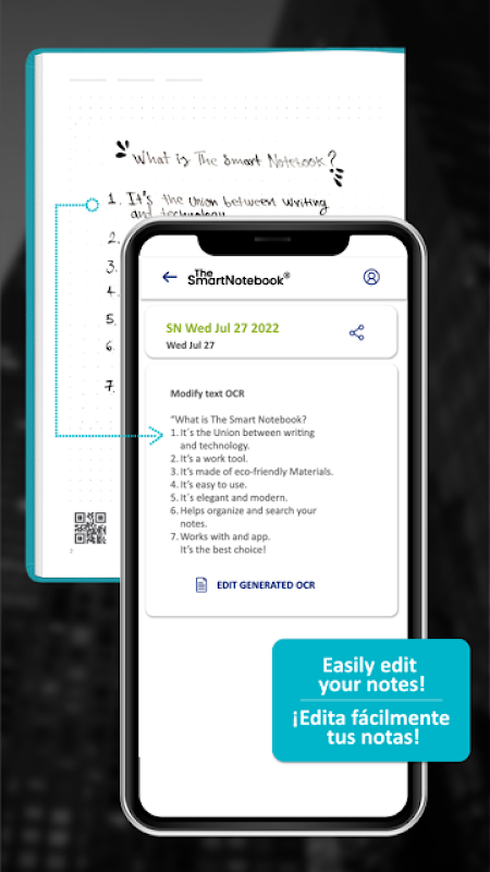 使用功能强大的 TheSmartNotebook 应用程序和您的智能手机,您可以扫描您的手写笔记以将其数字化。通过我们的 OCR 集成,您将能够通过智能词搜索索引在您的笔记中进行搜索。 SmartNotebook 应用程序允许您在不同的云中组织和共享您的笔记。该应用程序有五个符号(我们称它们为“快捷方式”),它们与它们一起将能够在云中共享您已经剪切干净并在几秒钟内以最敏捷和精确的方式转录的扫描。