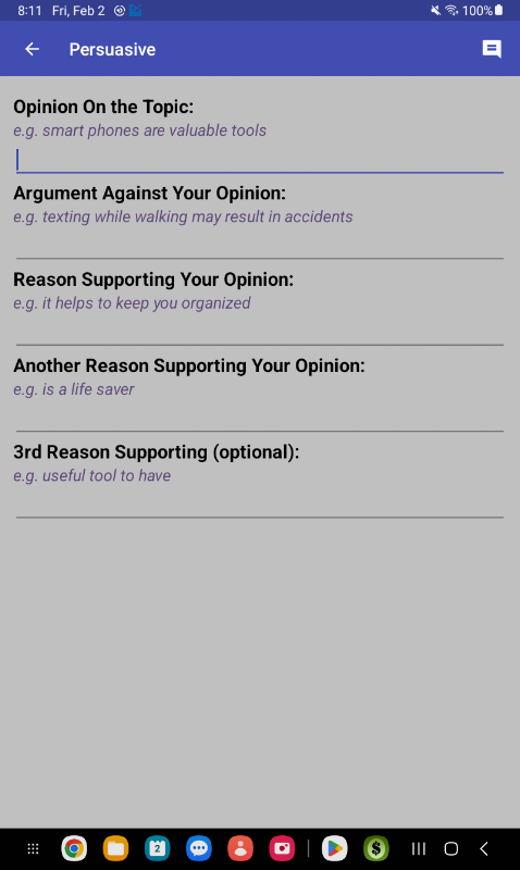 * 为有说服力的学期论文生成 4 篇论文陈述。