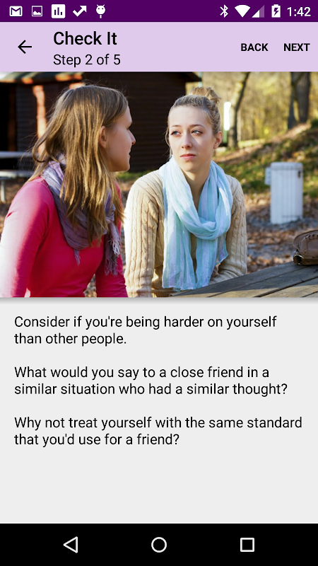 Thought Challenger helps you gain control of how you feel and what you do by teaching you to notice and challenge negative and unhelpful thoughts. Thought Challenger is built on cognitive behavioral therapy - a structure that has been found in clinical studies to be useful in examining negative thoughts and reframing them to help you feel better and do the things you want to do.