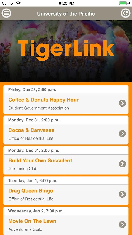 Use the University of the Pacific Events app to find out what events are happening and find out how you can get involved on campus!