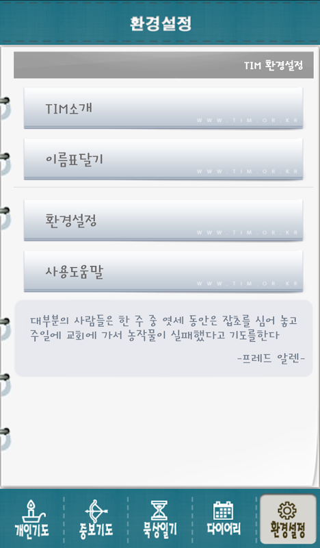 TIM기도노트는 '두란노 해외선교회'의 기도운동을 위한 어플리케이션입니다. 개인기도와 중보기도를 관리하고 TIM기도소식지를 공유하며 함께 기도운동을 하도록 도와줍니다. 또한 개인의 기도데이터를 기록하고 기록한 기도데이터를 유기적으로 통합관리할 수 있습니다.