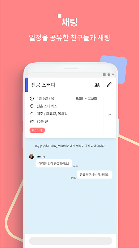 Time Share (타임쉐어)는 일정 관리, 일정 공유 그리고 채팅까지 할 수 있는 올인원 캘린더 서비스 앱입니다.