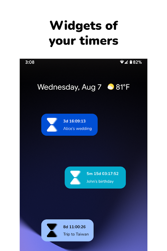 使用这款带小部件的多计时器应用程序,计算事件发生前的天数,或跟踪婚礼前或未来任何时间的剩余时间。例如,它非常适合确保您不会错过任何您关心的人的生日(它会提前几天通知您,以便您计划礼物!)