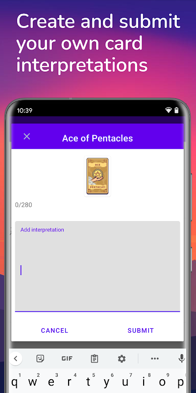 Tarot cards are not limited to one concrete interpretation. Each person is free to interpret them however they want based on life experience, intuition, or any other factors they decide. Tiny Tarot is the only app that allows users to submit their own individual card interpretations. Then those interpretations become available for other users to receive. This allows for a fluid, lively, and real tarot experience.