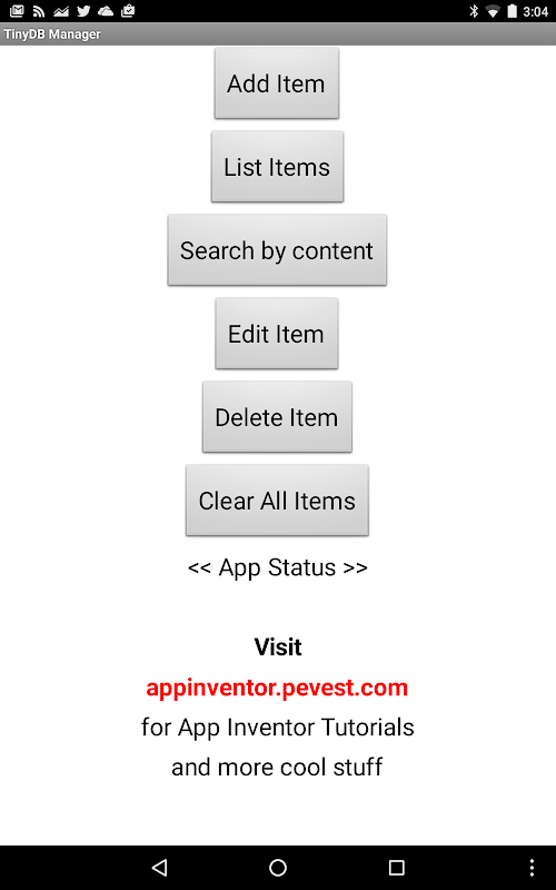 Use TinyDB Database Manager to display the content of your MIT App Inventor TinyDB database, add new items to the database, edit existing items in the database, search for items, delete individual items or clear out the entire database.