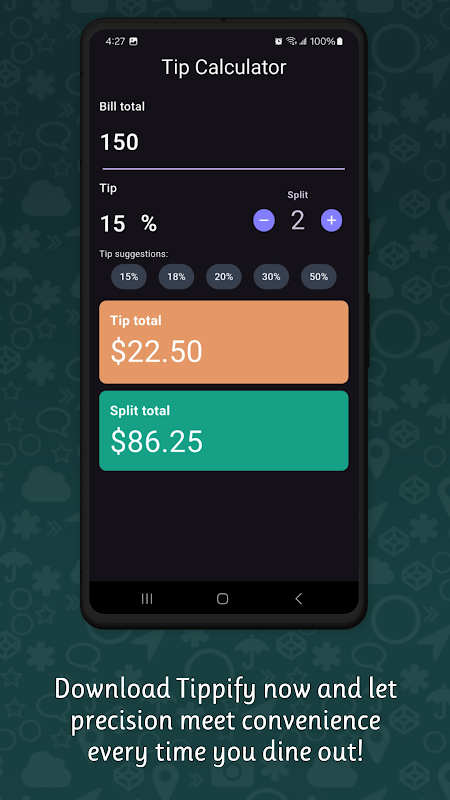 厌倦了手动计算小费?使用终极小费计算器应用程序 Tippify 告别麻烦。轻松确定小费并在几秒钟内与朋友分摊账单。 Tippify 具有简洁的界面和闪电般的计算速度,可确保无压力的用餐体验。自定义小费百分比,平均分摊账单。立即下载 Tippify,让您每次外出就餐时都享受精准与便利!