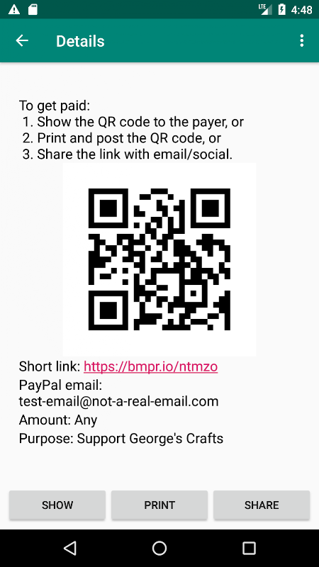 只需在指定字段中放入一封电子邮件以提示接收提示的位置,然后设置特定的接收数量或让支付提示者做出决定,就会立即为您生成QR码。然后,您可以在社交媒体上共享它,将其显示在手机/平板电脑上,或者将其打印并粘贴到您希望在其上显示的任何表面上