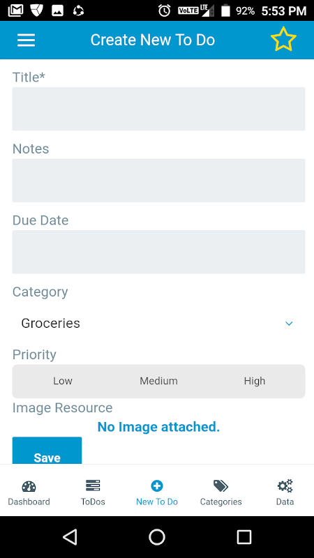 The application focuses on creating and managing To Dos.To Dos have attributes such as category, priority (low, medium or high), due date and they can be marked as important (starred) by the user.