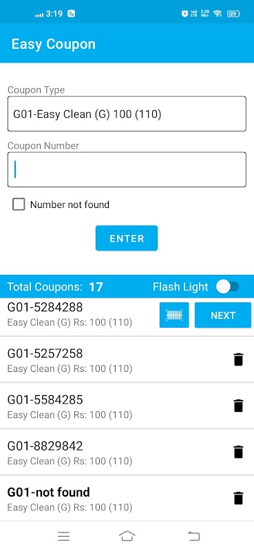 EasyCoupon 是一款应用程序,可让涂料公司的销售经理使用其条形码扫描涂料优惠券(通常称为涂料令牌)并准备优惠券列表并打印该列表。该列表将显示按油漆类型排列的优惠券条形码编号,以及每个油漆类别的总金额、价格和总计。